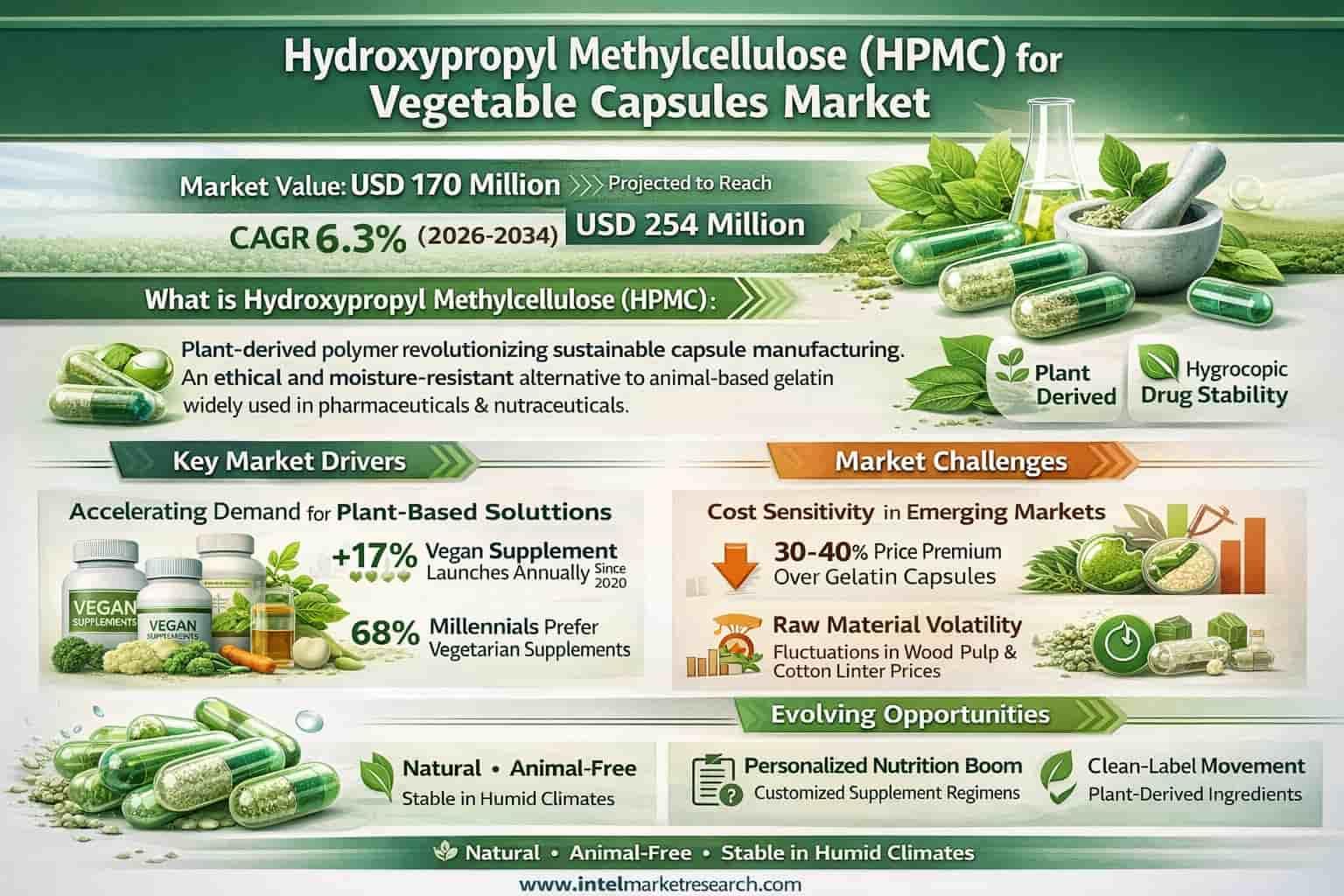 Hydroxypropyl Methylcellulose (HPMC) for Vegetable Capsules Market to Grow at a CAGR of 6.3% during the Forecast Period – Key Players to Watch Global Hydroxypropyl Methylcellulose (HPMC) for Vegetable Capsules market was valued at USD 170 million in 2025 and is projected to reach USD 254 million by 2034, growing at a steady CAGR of 6.3% during the forecast period. 📥 Download Sample Report: https://www.intelmarketresearch.com/download-free-sample/30856/hydroxypropyl-methylcellulose-for-vegetable-capsules-market 🌐 Website: https://www.intelmarketresearch.com 📞 Asia-Pacific: +91 9169164321 🔗 LinkedIn: Follow Us