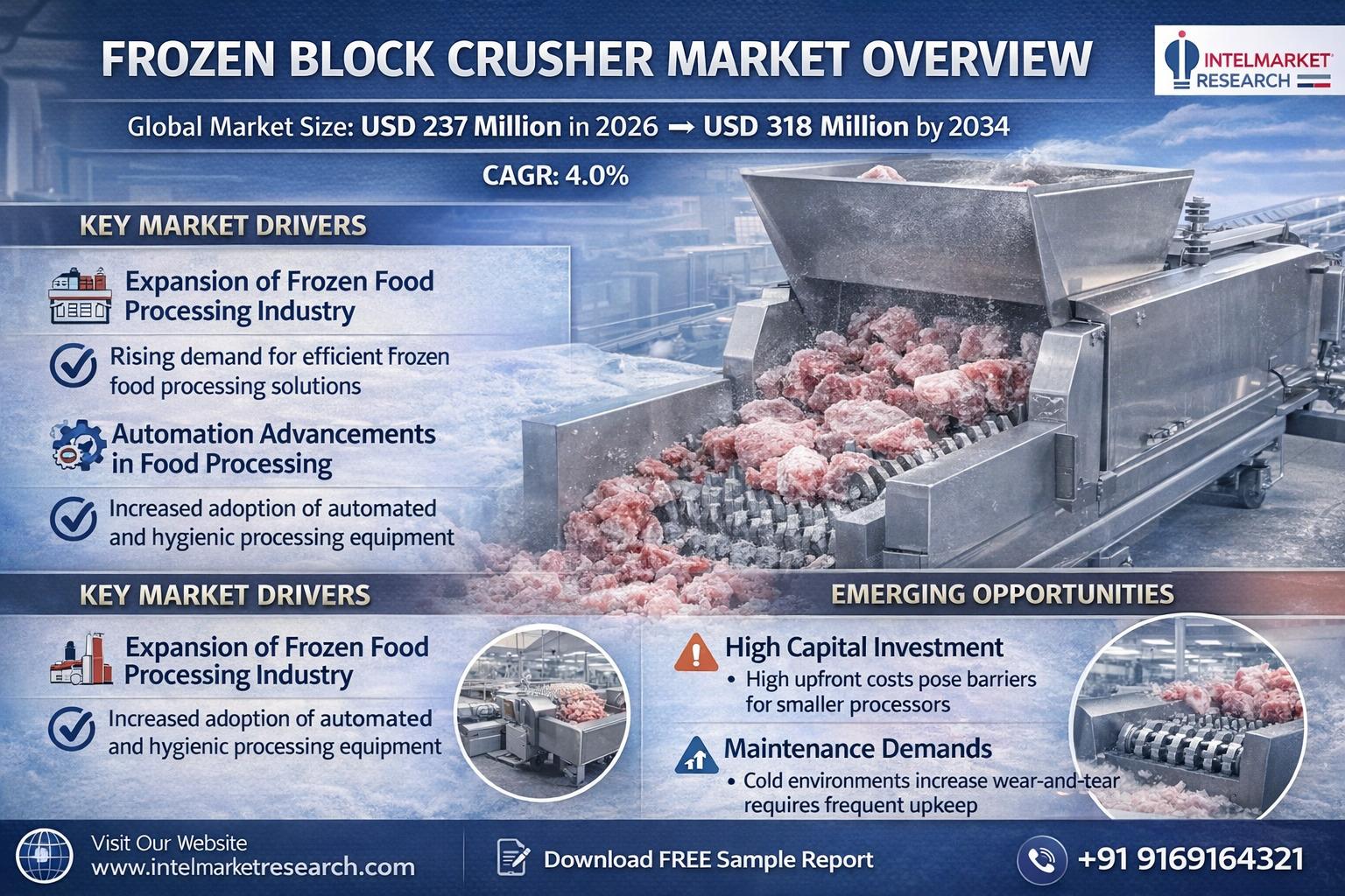 Global Frozen Block Crusher Market Projected to Reach USD 318 Million by 2034, Growing at a CAGR of 4.0%; Key Players and Trends According to a new report from Intel Market Research, Global Frozen Block Crusher market was valued at USD 237 million in 2025 and is projected to reach USD 318 million by 2034, growing at a CAGR of 4.0% during the forecast period (2026-2034). This growth is fueled by rising automation in food processing facilities and increased demand for efficient frozen food processing solutions. What is a Frozen Block Crusher? Frozen Block Crushers are specialized industrial machines designed to break down frozen blocks of food products, chemicals, and other materials into smaller, uniform pieces. These machines utilize heavy-duty rotors, knives, or toothed rollers to fracture hardened frozen masses while maintaining precise control over particle size distribution. With features like anti-jam feeding mechanisms and hygienic stainless-steel construction, these crushers play a critical role in cold-chain processing operations across multiple industries. This comprehensive report provides detailed insights into the global Frozen Block Crusher market landscape, covering everything from macro-level market trends to micro-level competitive analysis. The study examines key growth drivers, challenges, opportunities, and technological advancements shaping this specialized equipment sector. πŸ“˜ Get Full Report Here: Frozen Block Crusher Market - View Detailed Research Report πŸ“₯ Download FREE Sample Report: https://www.intelmarketresearch.com/download-free-sample/36498/frozen-block-crusher-market