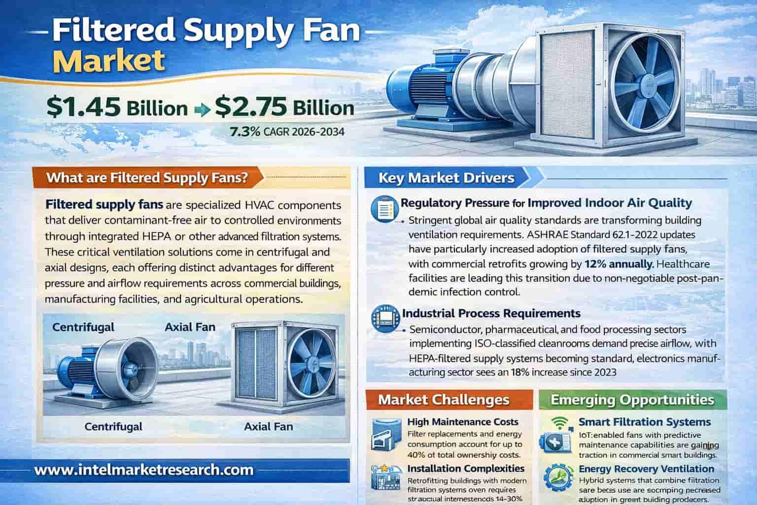 According to a new report from Intel Market Research, the global Filtered Supply Fan market was valued at USD 1.45 billion in 2025 and is projected to reach USD 2.75 billion by 2034, growing at a CAGR of 7.3% during the forecast period (2026–2034).
