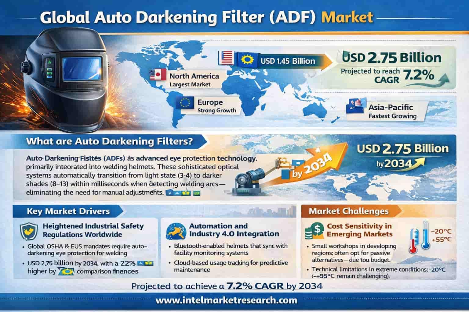 Global Auto Darkening Filter (ADF) Market Projected to Reach USD 2.75 Billion by 2034, Growing at a 7.2% CAGR; Key Players and Trends Global Auto Darkening Filter (ADF) market was valued at USD 1.45 billion in 2025 and is projected to grow at a CAGR of 7.2% to reach USD 2.75 billion by 2034. 📥 Download FREE Sample Report: https://www.intelmarketresearch.com/download-free-sample/32178/auto-darkening-filter-market 🌐 Website: https://www.intelmarketresearch.com 📞 Asia-Pacific: +91 9169164321 🔗 LinkedIn: Follow Us