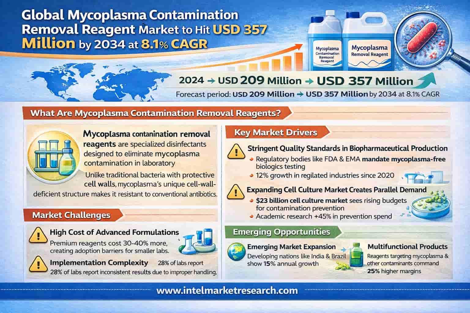 Global Mycoplasma Contamination Removal Reagent Market to Hit USD 357 Million by 2034 at 8.1% CAGR; Key Players and Industry Trends According to a new report from Intel Market Research, the global Mycoplasma Contamination Removal Reagent market was valued at USD 209 million in 2024 and is projected to reach USD 357 million by 2034, growing at a steady CAGR of 8.1% during the forecast period. 📥 Download FREE Sample Report: https://www.intelmarketresearch.com/download-free-sample/30778/mycoplasma-contamination-removal-reagent-market 🌐 Website: https://www.intelmarketresearch.com 📞 Asia-Pacific: +91 9169164321 🔗 LinkedIn: Follow Us