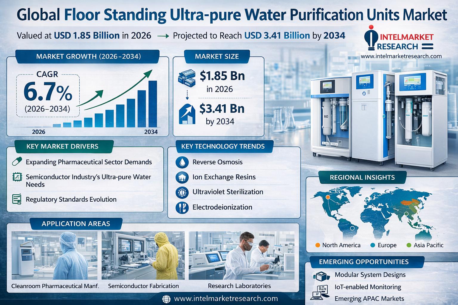 According to a new report from Intel Market Research, Global Floor Standing Ultra-pure Water Purification Units market was valued at USD 1.85 billion in 2025 and is projected to reach USD 3.41 billion by 2034, growing at a CAGR of 6.7% during the forecast period (2026–2034). This growth is driven by increasing demand from pharmaceutical and semiconductor industries, along with stringent regulatory requirements for water purity in critical applications.